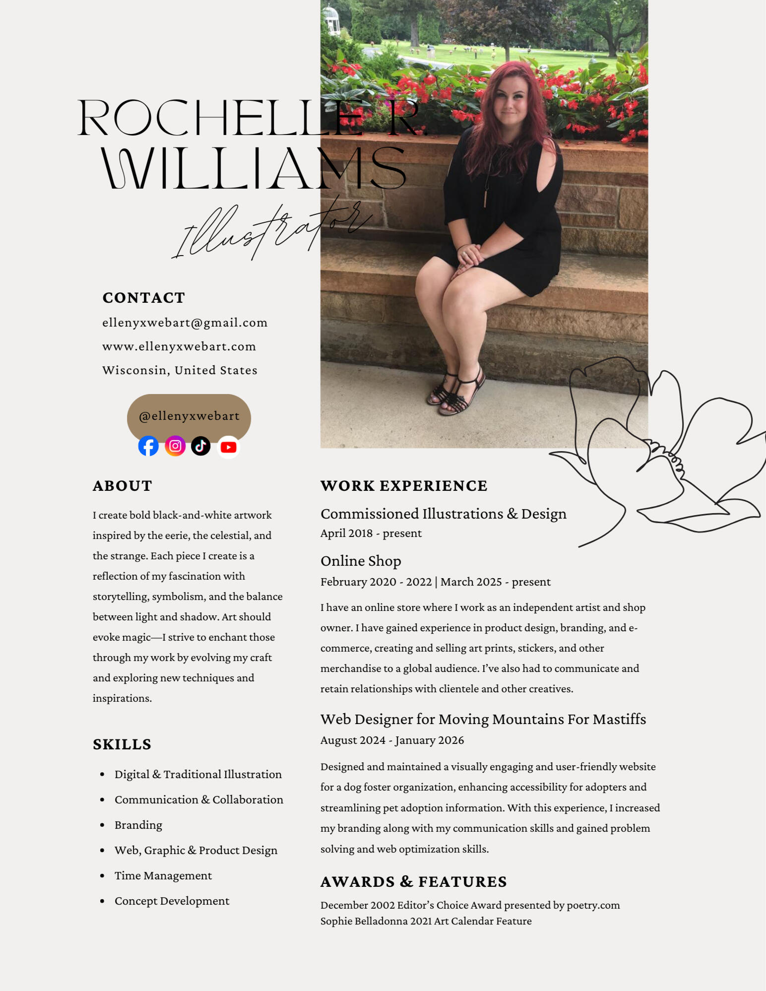 Meowdy there, Iām Rochelle! The gremlin behind this artsy-fartsy account. Since I was little, Iāve found solace in the fusion of writing, art, and the eerie. Whether it was drawing the fae in the forest or making potions in the backyard, Iāve always been creating something. If Iām not found within my plant oasis sketching, Iām either reading a spooky book, indulging in the thrills of a horror movie, gaming and/or relishing the simple pleasure of a perfectly crafted sandwich.Inspired by all things unusual, my brand is blackwork with botanics, the feminine form and all things spooky, witchy and gothic. I've also been having a lot of fun learning watercolors. I have an aim to prove that there is beauty in everything, even things we canāt fully grasp like the dark and mystical worlds of the unknown.The art you find here is made from countless amounts of doodling, research and composition work (but mostly trial and error) until I finally love it enough to share. I hope you love it too!